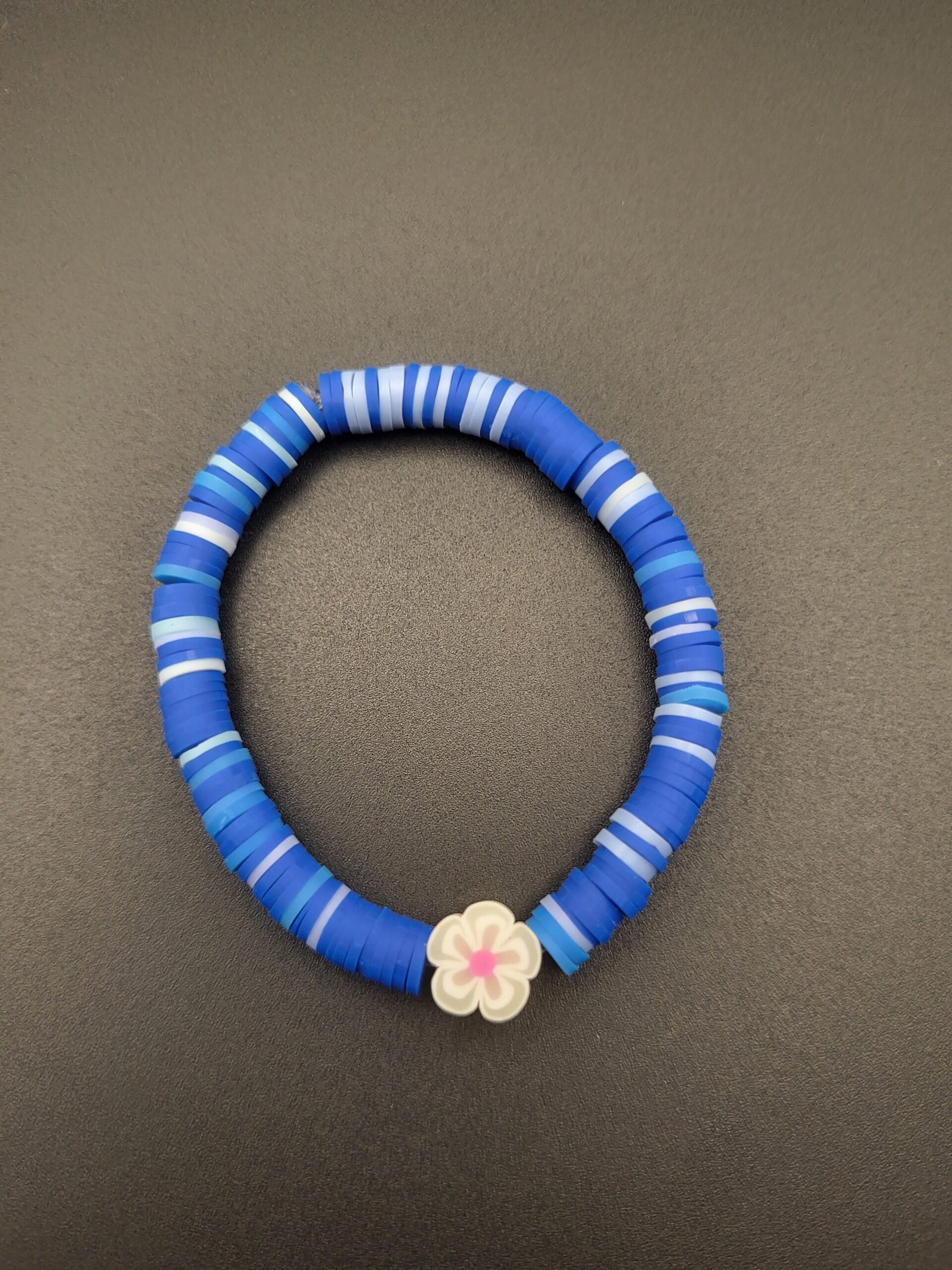 A tot’s adorbs blue clay bead bracelet giving the vibes of Hawaii.