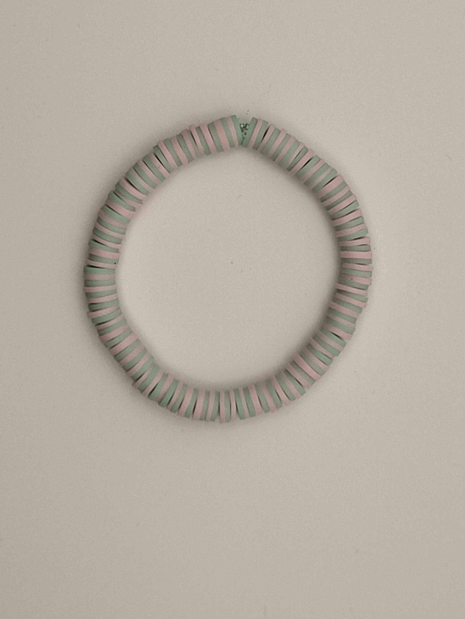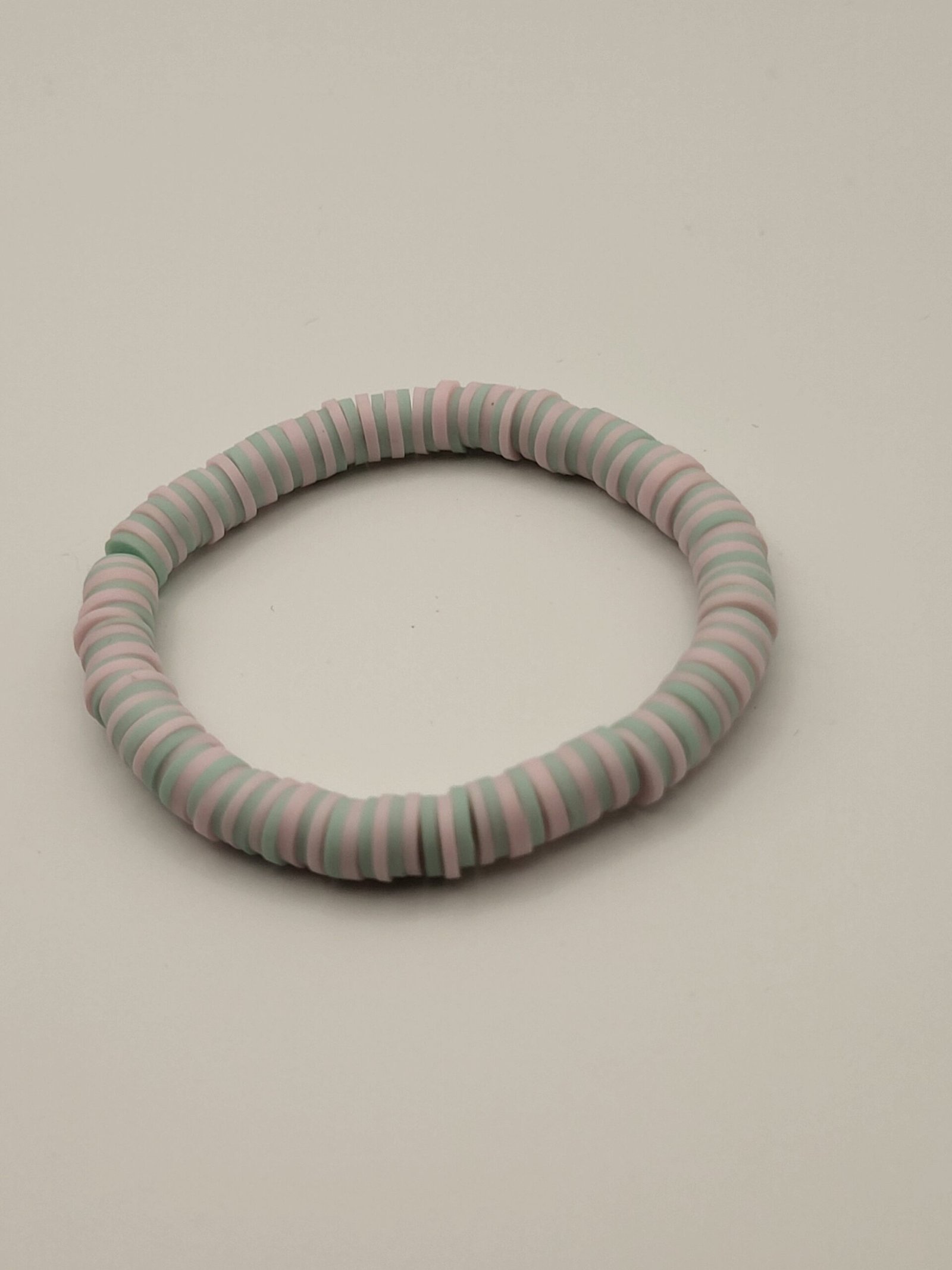 A heart felt, simple design clay bead bracelet, featuring the gorgeous colors of baby blue & baby pink.